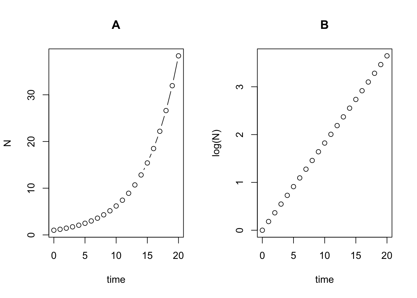 If we plot exponential growth on a log scale we can see that it is straight line. For example, in the plot below I show the sequence for a population with a starting population of 1 and a \(\lambda\) (population multiplication rate) of 1.2 (i.e., the population increases by 20% each year). In (A) the time series is plotted on the natural scale while in (B) it is plotted on the log scale.