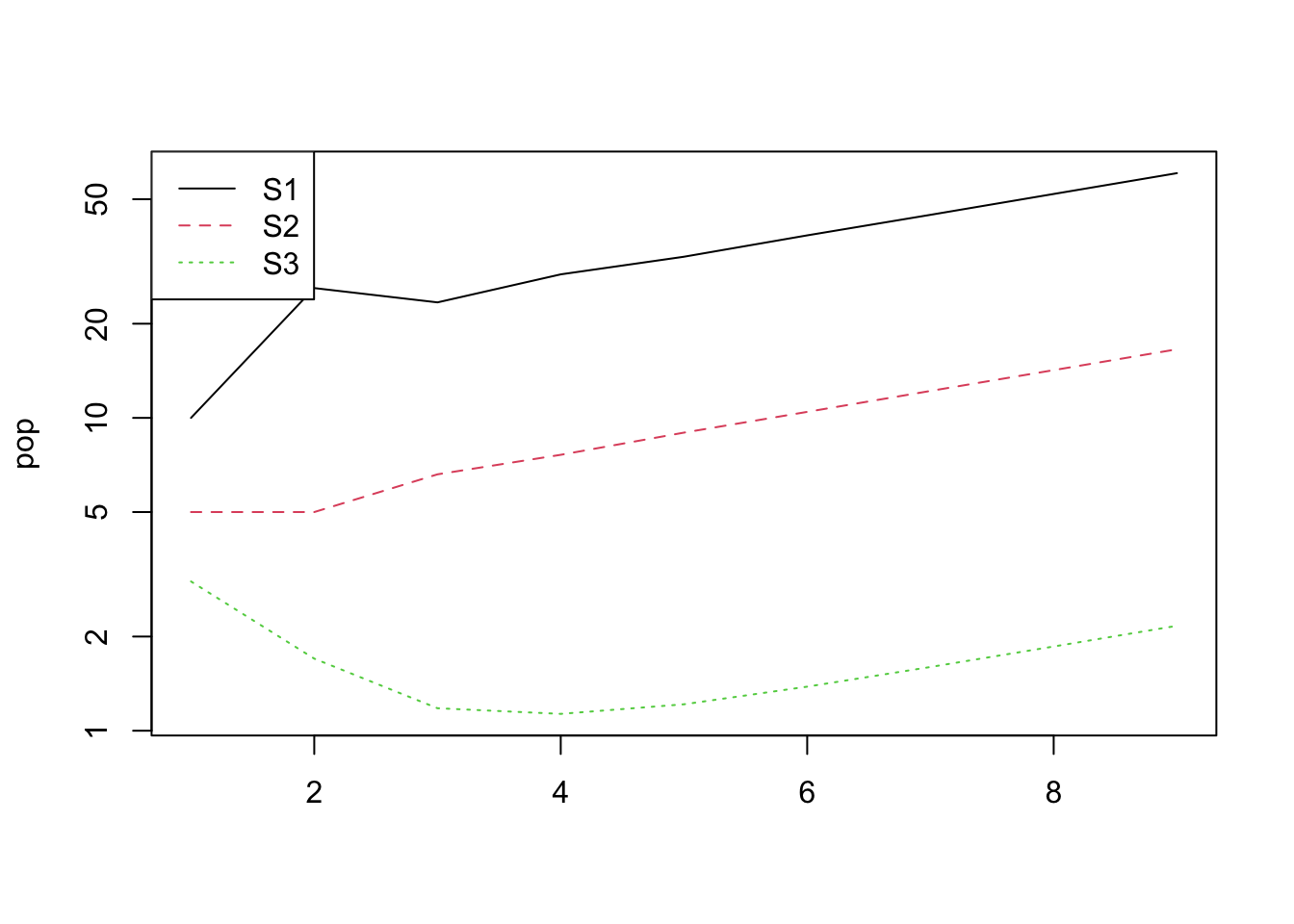 Take a look at pr, the projected population. This gives you the total population size, and below that the population sizes in each stage.